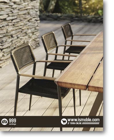 Quizás prefieres un toque más elegante? Entonces tu opción preferida será el catálogo 999. Estos muebles exteriores son de teca maciza. Puedes escoger entre sillas, mesas, sofás y tumbonas, aportando armonía y equilibrio a un ambiente natural y mediterráneo. Los acabados de las mesas y sillas también se pueden pedir de madera maciza de iroko.